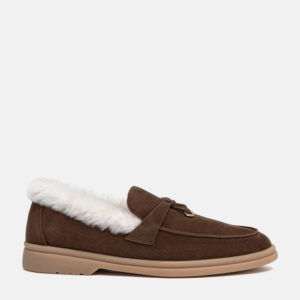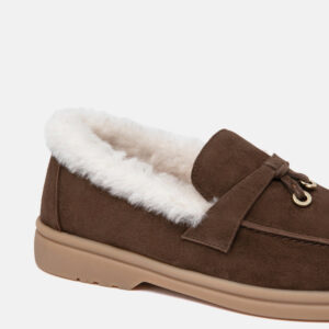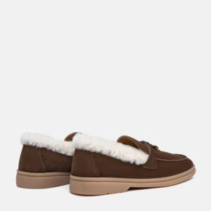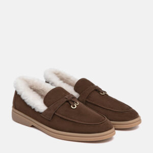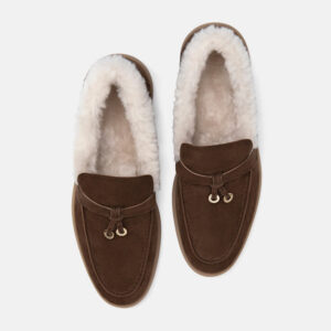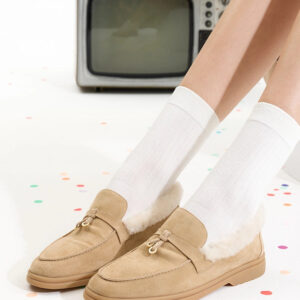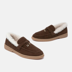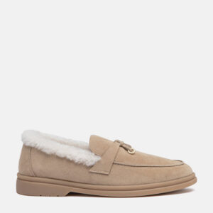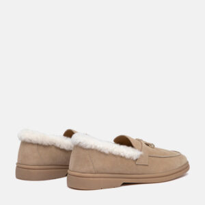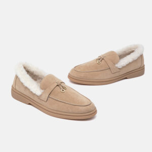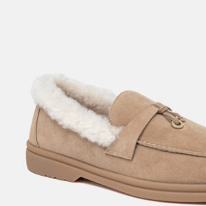 A refined take on cold-weather essentials, these suede loafers exude effortless sophistication. Crafted from velvety suede in an elegant neutral hue, they are lined with plush wool for unparalleled warmth and comfort. The almond-toe silhouette, paired with delicate knot detailing and subtle gold-tone hardware, strikes the perfect balance between timeless and contemporary. Set on a durable rubber sole, they offer all-day ease.