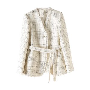 Tweed Blazer Jackets for Women Long Sleeve Elegant Office Work Business Casual Cropped Tweed Jacket