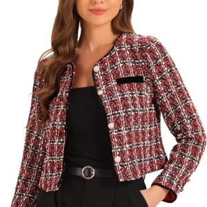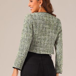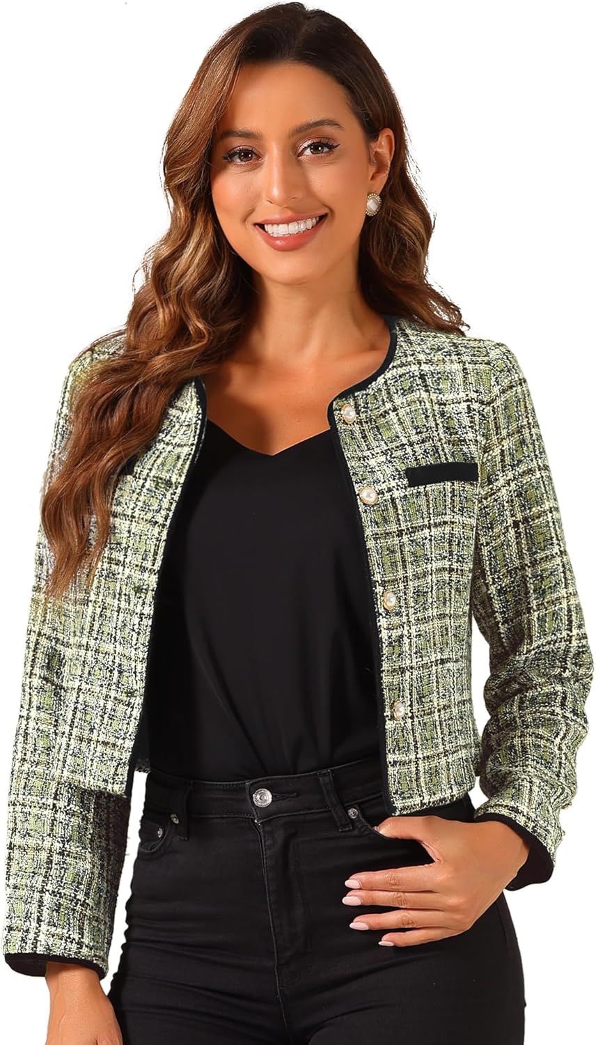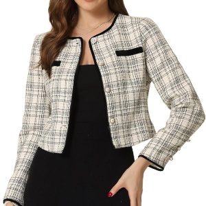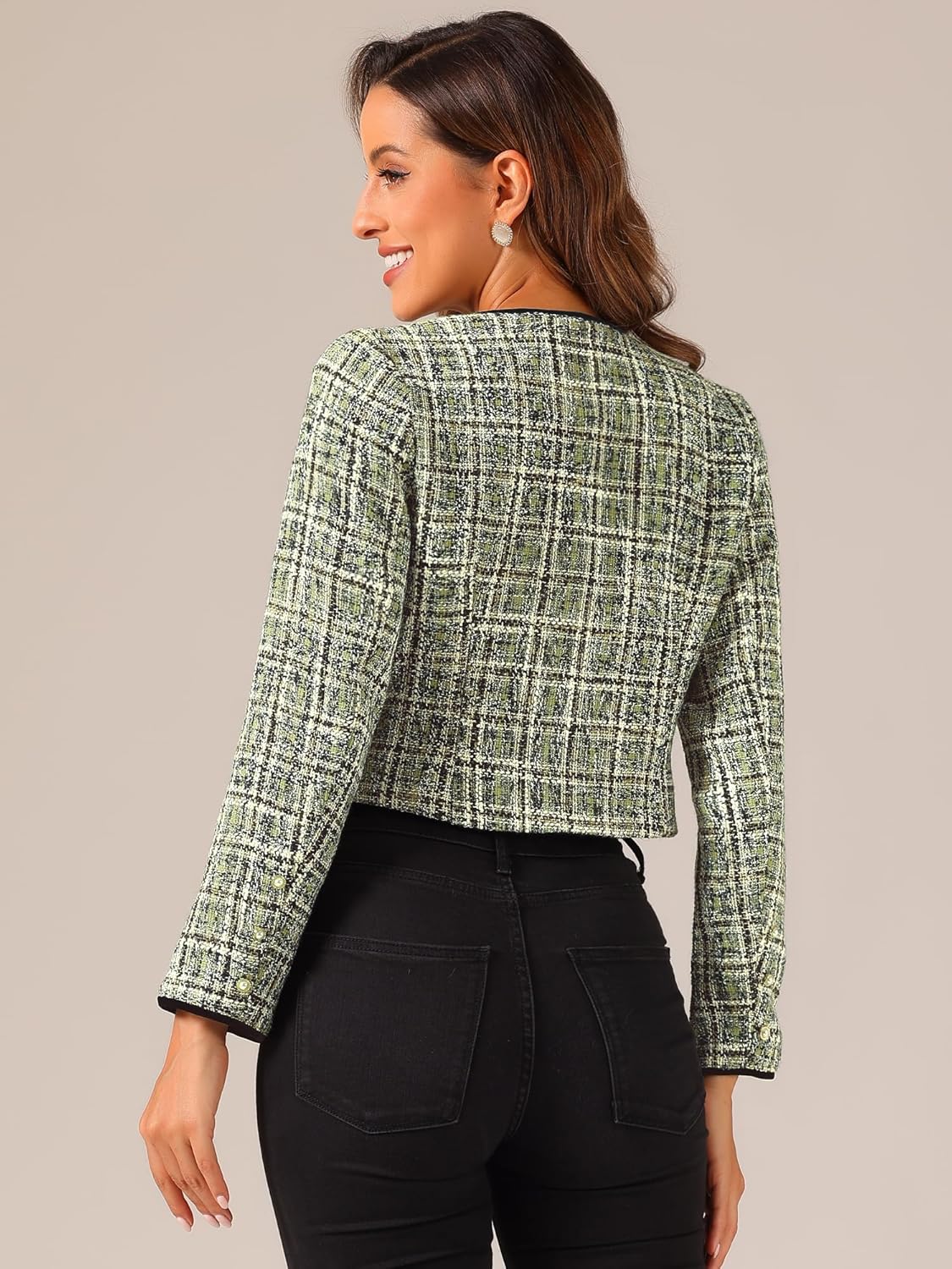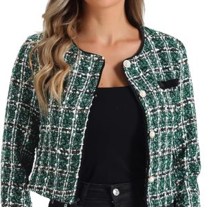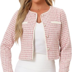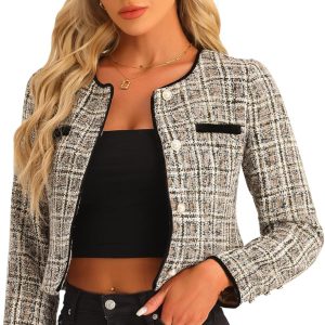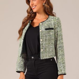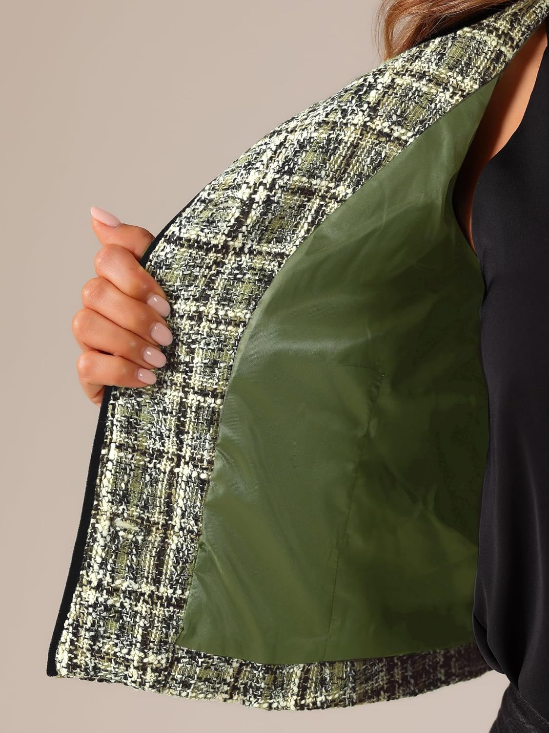 Tweed Jacket for Women’s Long Sleeve Casual Work Office Plaid Short Outwear
