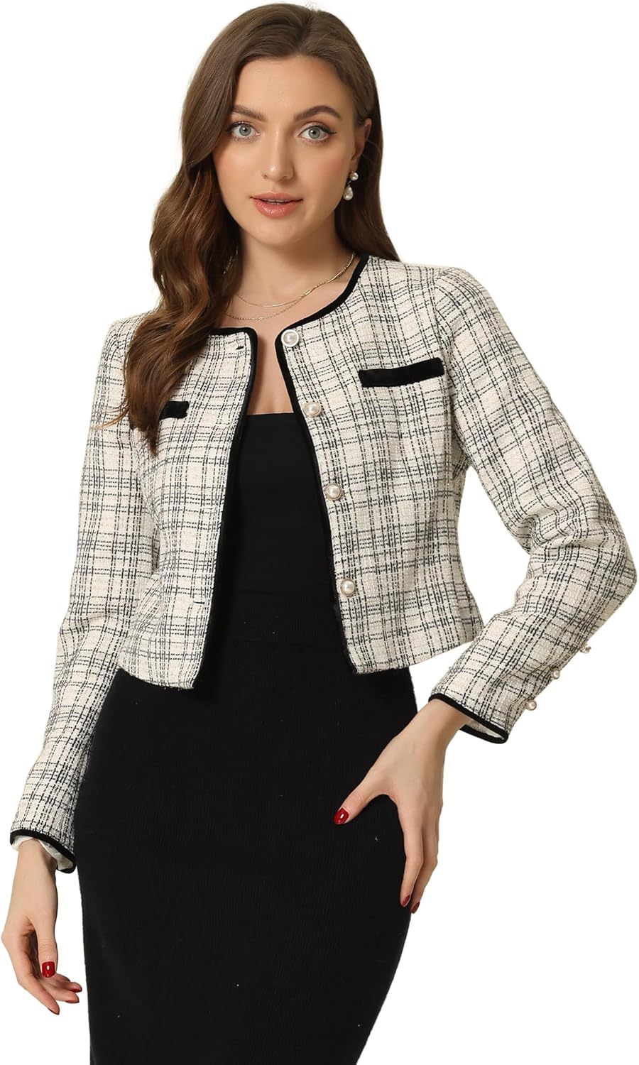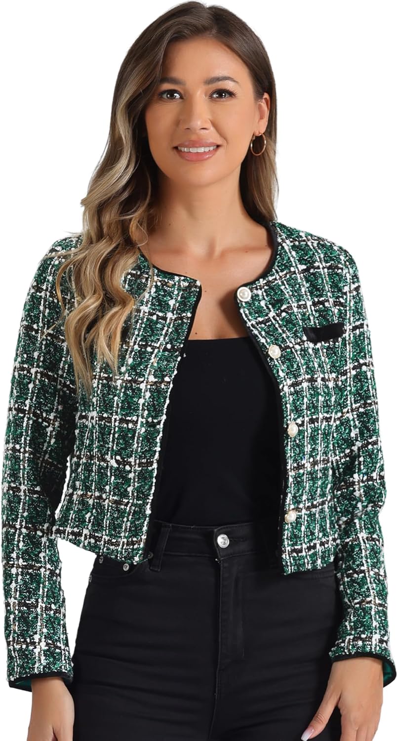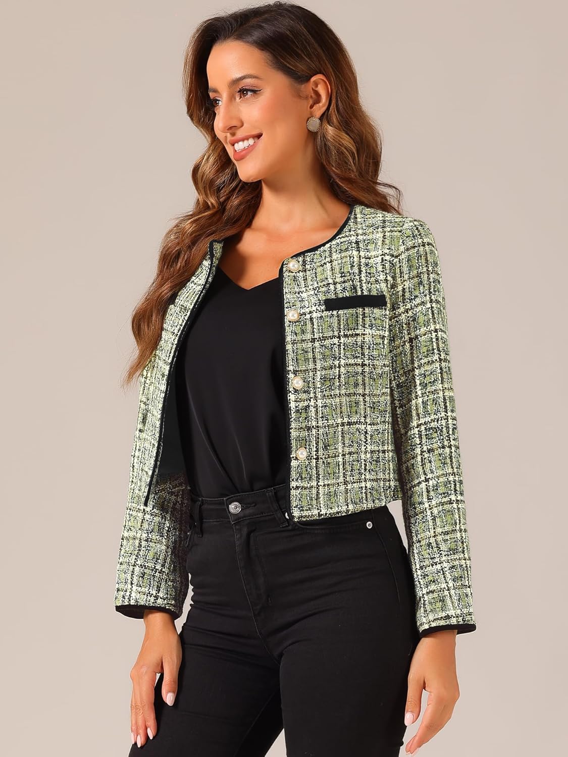 Tweed Jacket for Women’s Long Sleeve Casual Work Office Plaid Short Outwear