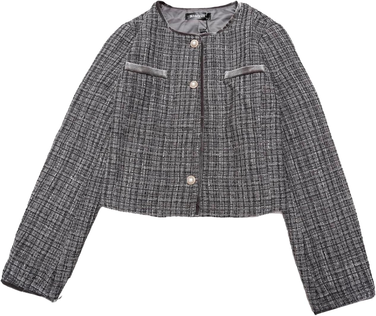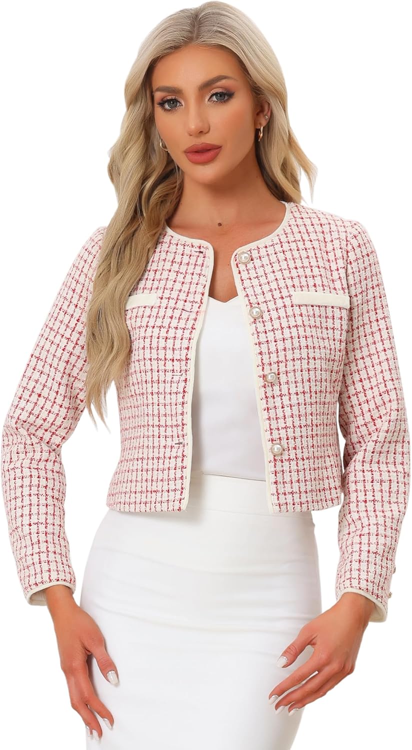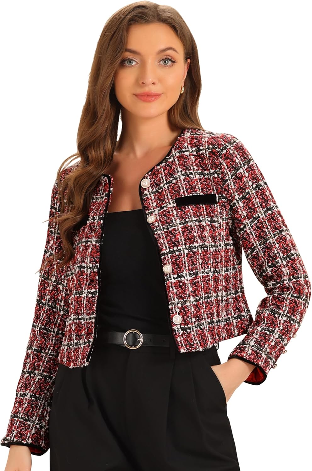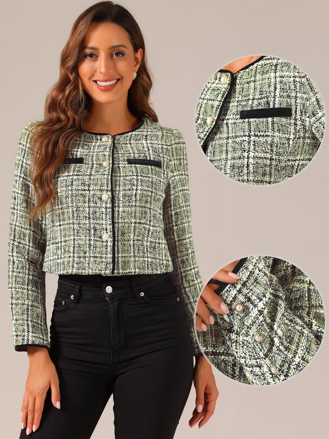 Tweed Jacket for Women’s Long Sleeve Casual Work Office Plaid Short Outwear