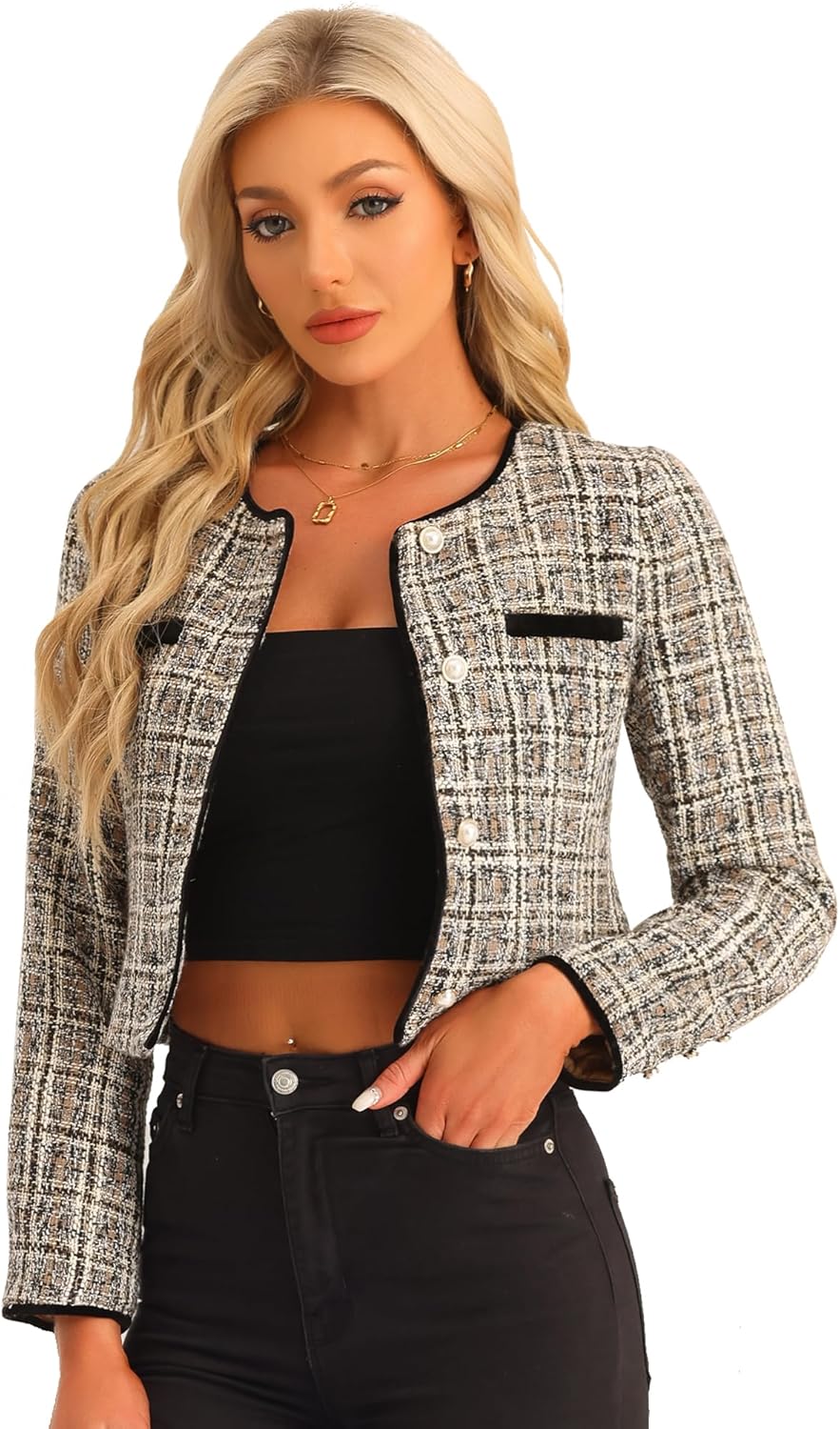 Tweed Blazer Jackets for Women Long Sleeve Elegant Office Work Business Casual Cropped Tweed Jacket
