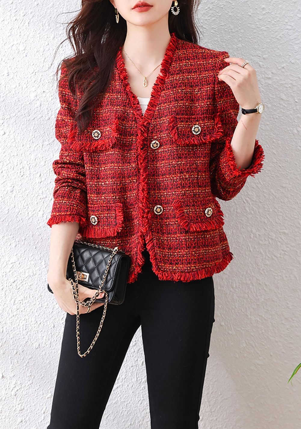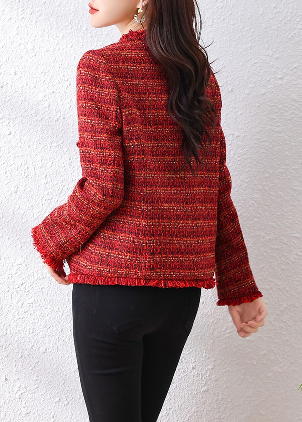 Elegant tweed blazer in slim fit, made of soft and textured high quality woven material, which is warm and comfy to wear; Soid color: red available. Perfect for spring, fall and early winter to wear