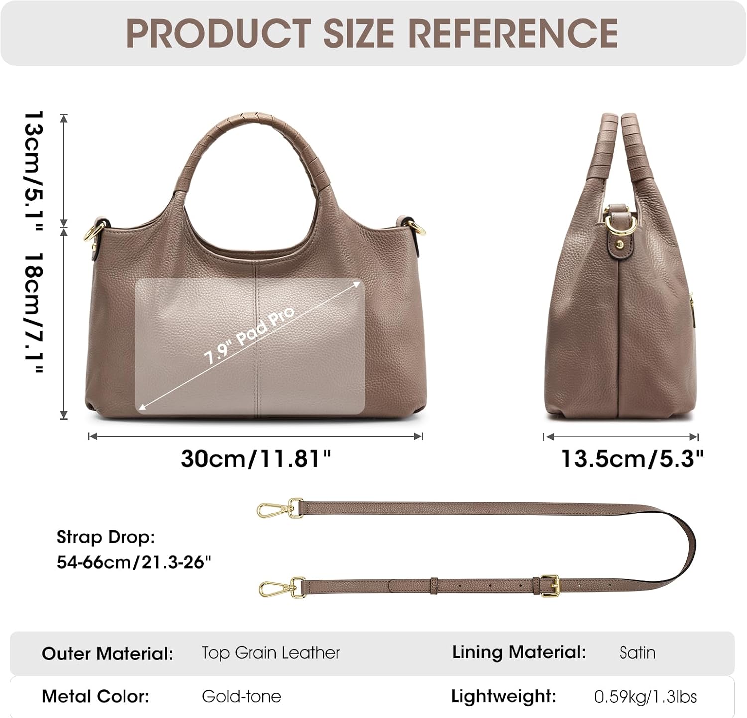 STRUCTURE: 11.81” x 5.3” x 7.1” (L*W*H). Weight: 1.3 lbs. This leather top handle purse can fit up to 7.9” tablet. Totally 6 pockets. This leather purses for your cards, Pad, cosmetics, passport, etc